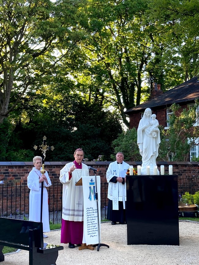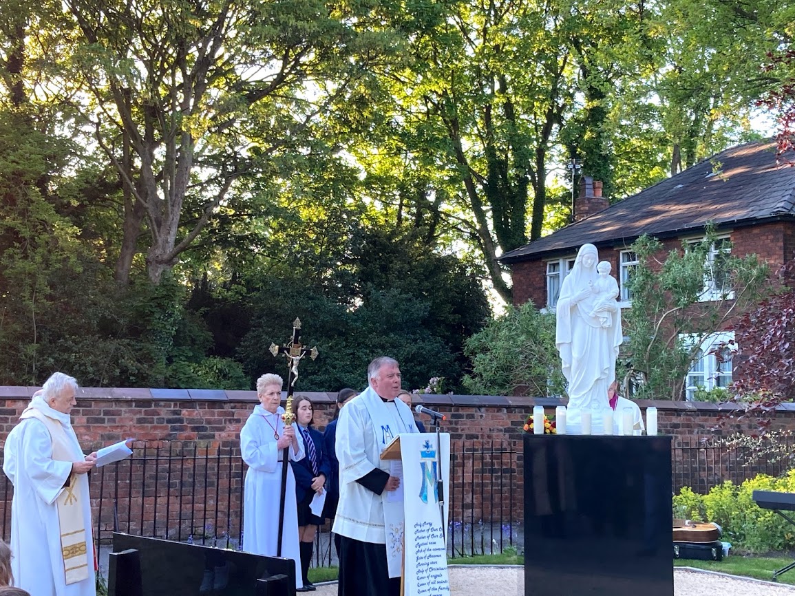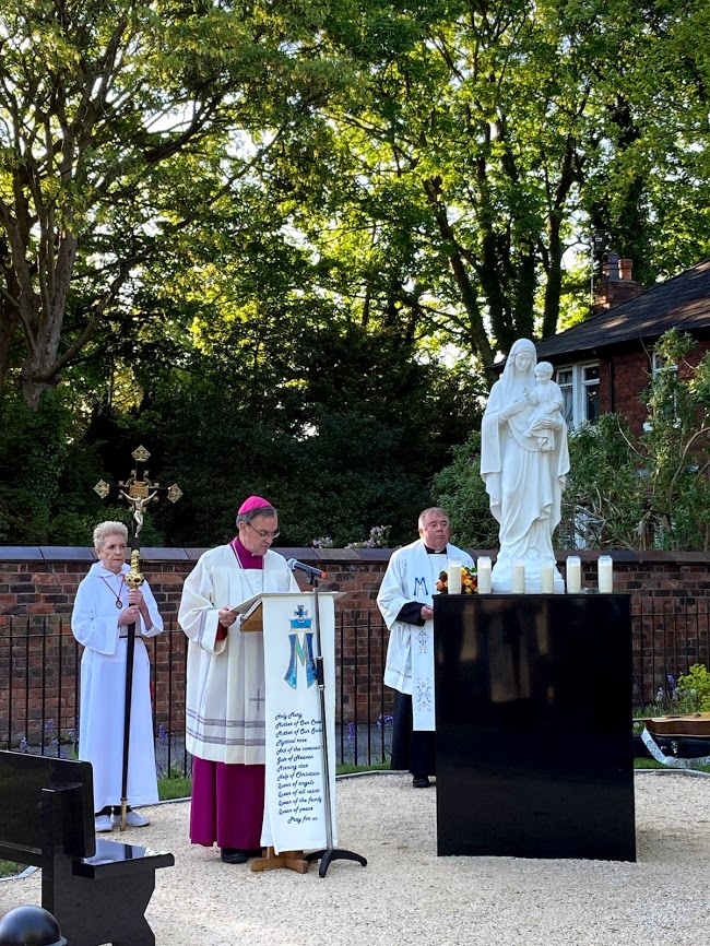 With the continued easing of restrictions, the parish was pleased to be able to welcome the Right Reverend John Arnold, Bishop of Salford, on the evening of Wednesday 19 May to consecrate and bless the new prayer shrine to Our Lady which has recently been installed in the grounds of the church. We were blessed with glorious sunshine and blue skies, a sure sign of hope for better times ahead, as Fr Mark welcomed those present.